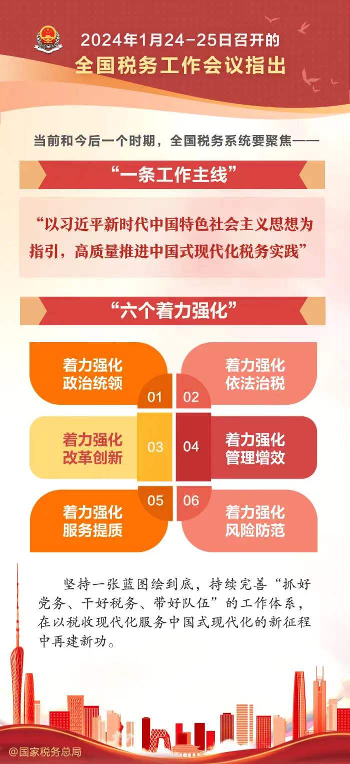 1月24日到25日,全國(guó)稅務工作會議在北(běi)京召開,總結了2023年(nián)的(de)稅務工作,并部署了2024年(nián)重點工作方向,其中稅務依然是今年(nián)的(de)重點,咱們一(yī)起來看看都講了什麽~